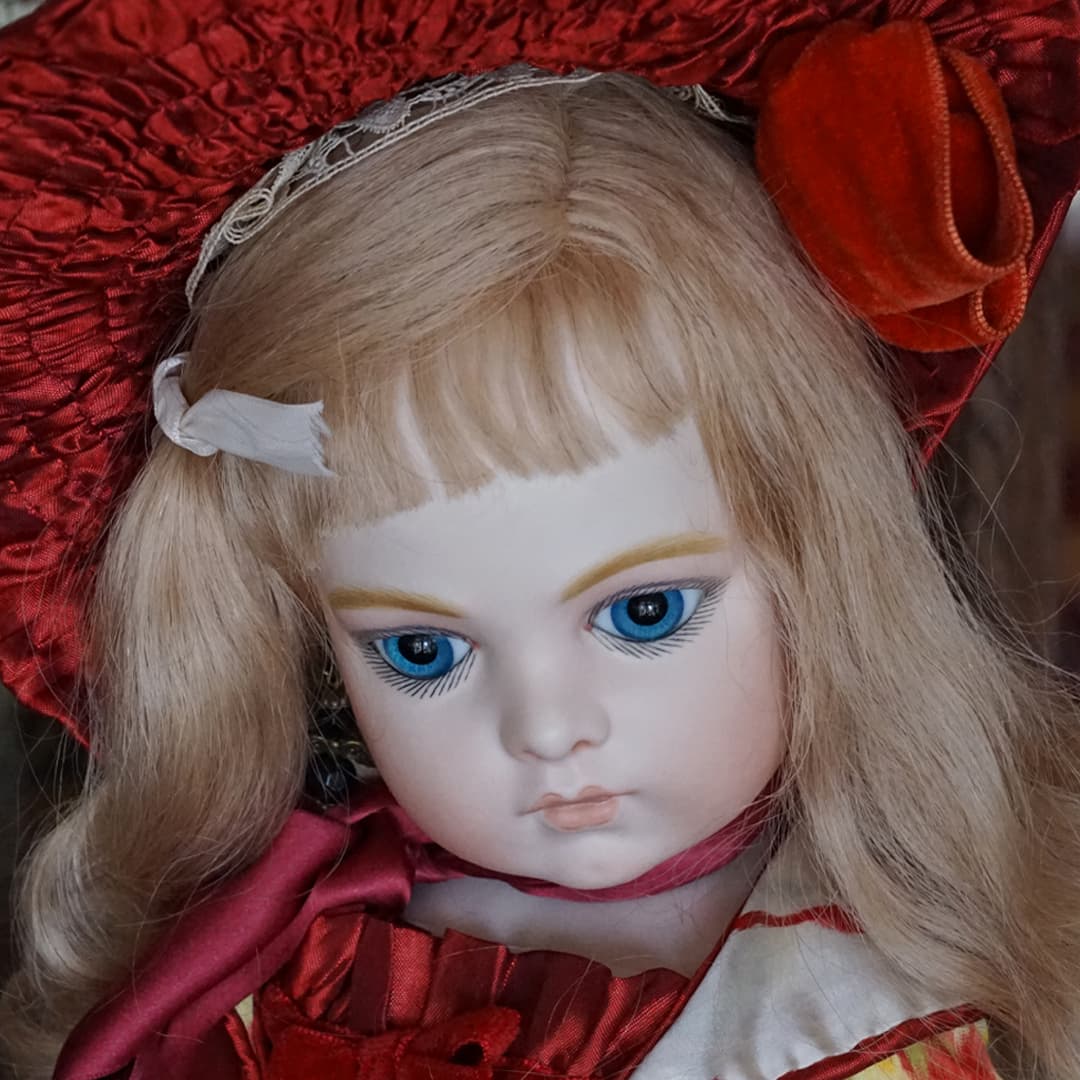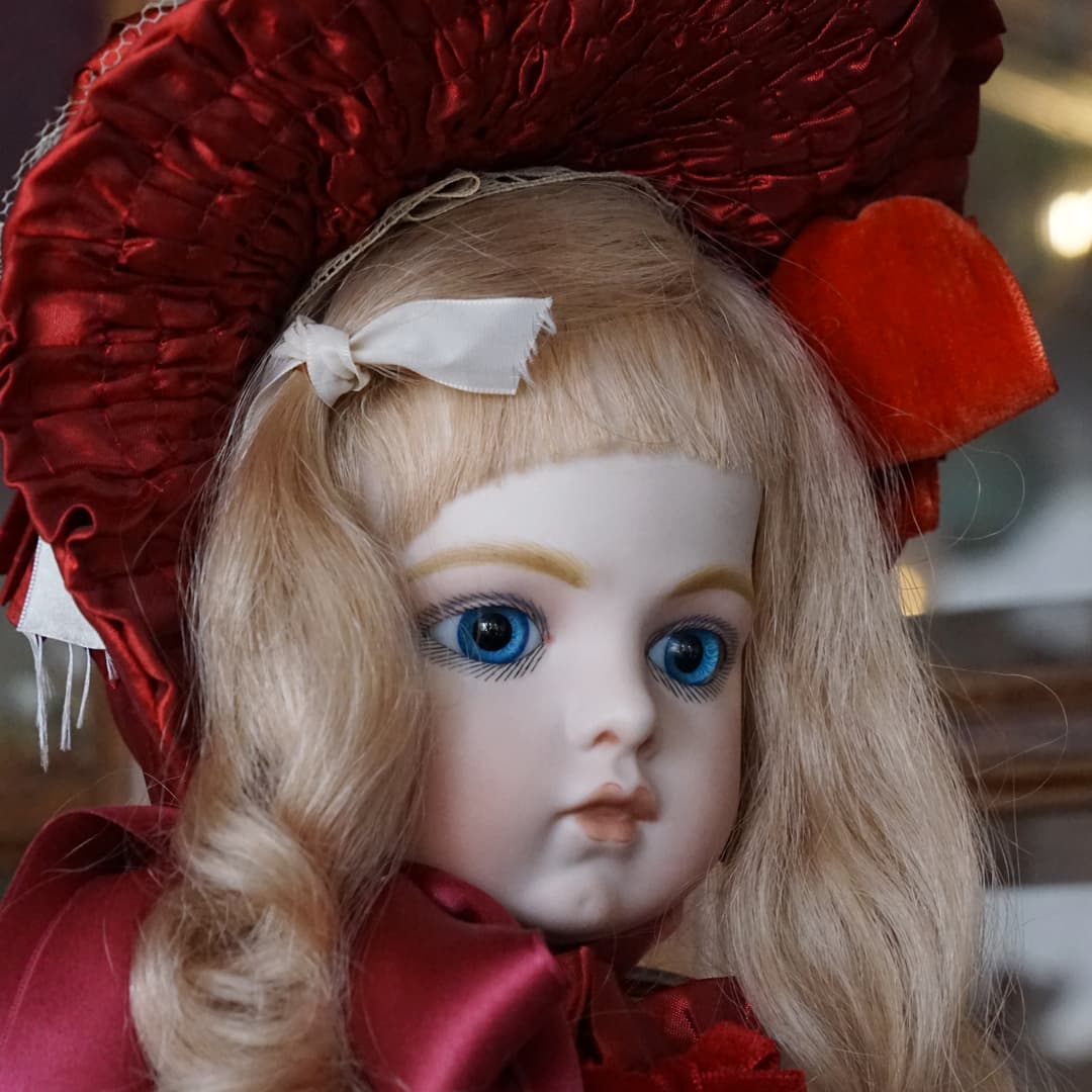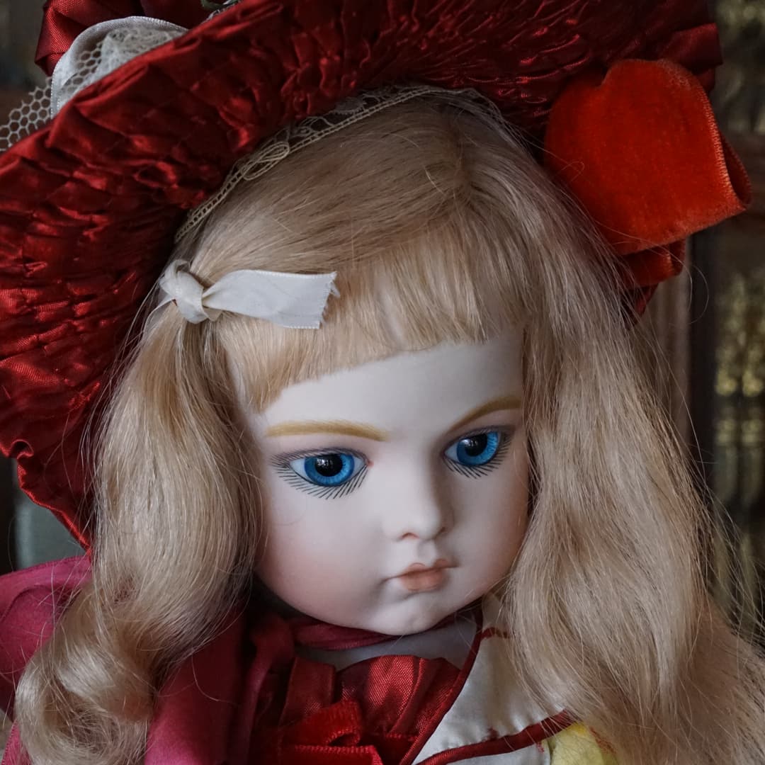 美の絶対女王、ブリュ・ジュン。人目を引く美貌に生まれた孤高ゆえか、どこか険のある表情には近寄りがたさを感じます。神秘的な青い瞳は、作家があてがうグラスアイとしては稀な鮮やかさで、真紅のドレスも鮮烈です。強い色彩をまとめあげきる美貌だからこそ、作家は確信を持って色を決めたのでしょう。 際立った美貌の放つ威光に、当初スタッフも圧倒されましたが、ある時恐る恐る目を合わせると、あどけなく切り揃えられた前髪の下に潜む、穏やかで柔和な素顔に驚きました。 美と可憐さの二重奏たるこのブリュ・ジュンを、ぜひ直にお確かめください。 |