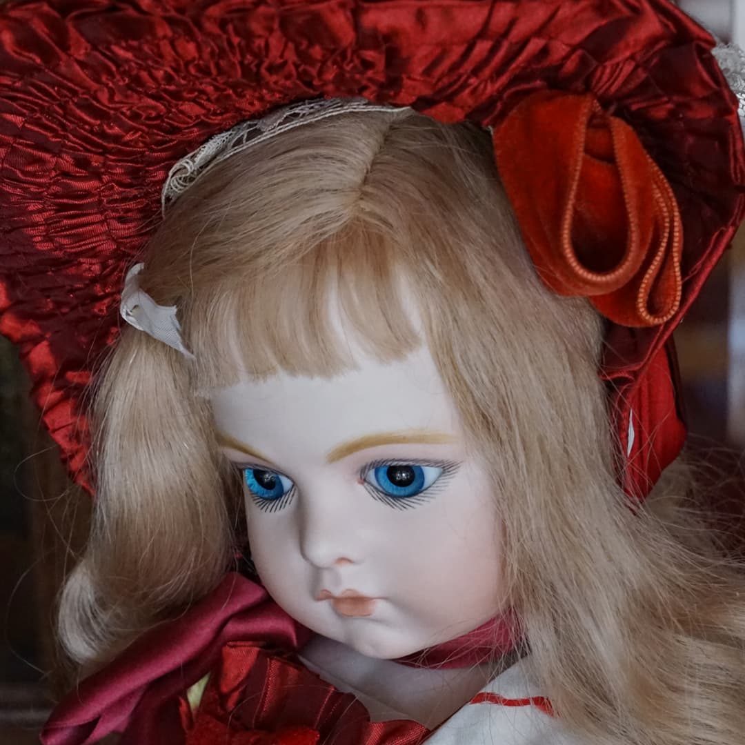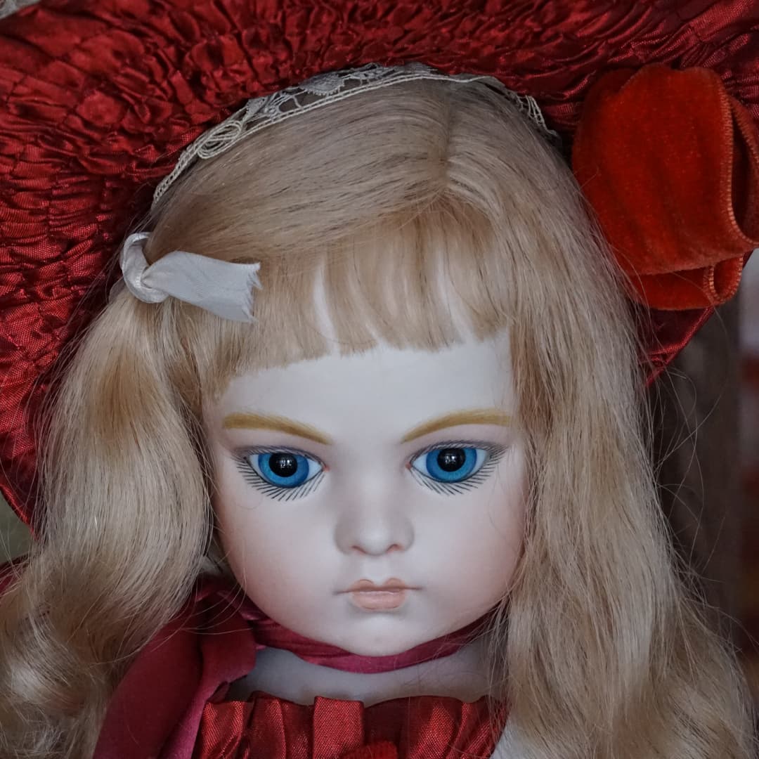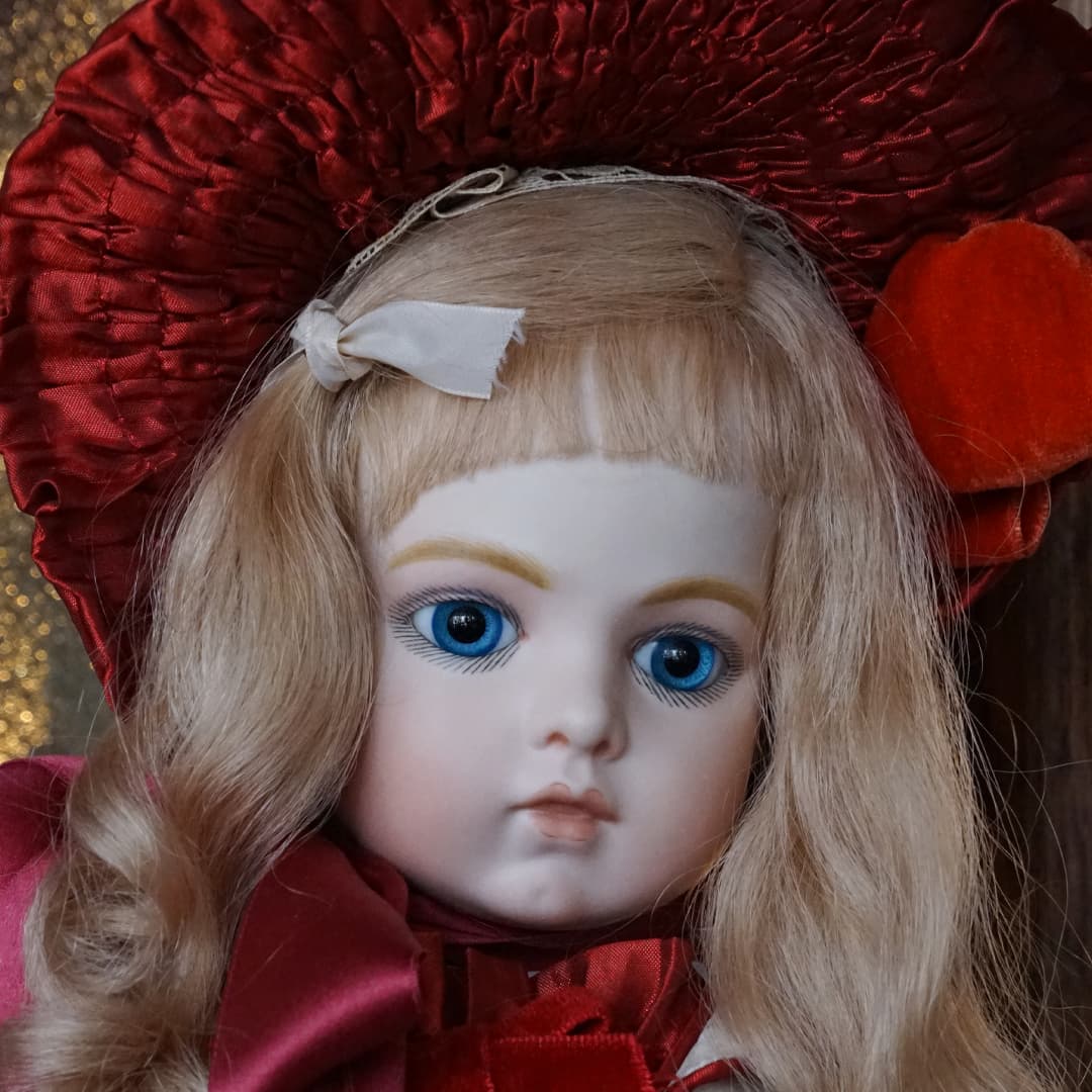 美の絶対女王、ブリュ・ジュン。人目を引く美貌に生まれた孤高ゆえか、どこか険のある表情には近寄りがたさを感じます。神秘的な青い瞳は、作家があてがうグラスアイとしては稀な鮮やかさで、真紅のドレスも鮮烈です。強い色彩をまとめあげきる美貌だからこそ、作家は確信を持って色を決めたのでしょう。 際立った美貌の放つ威光に、当初スタッフも圧倒されましたが、ある時恐る恐る目を合わせると、あどけなく切り揃えられた前髪の下に潜む、穏やかで柔和な素顔に驚きました。 美と可憐さの二重奏たるこのブリュ・ジュンを、ぜひ直にお確かめください。 |