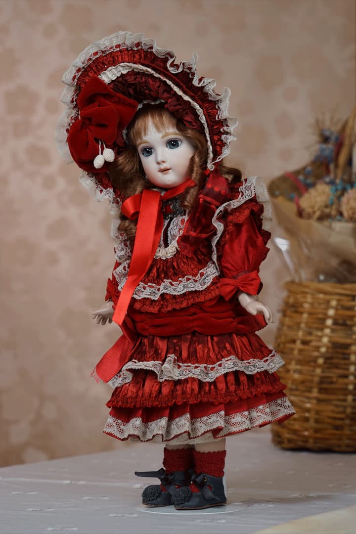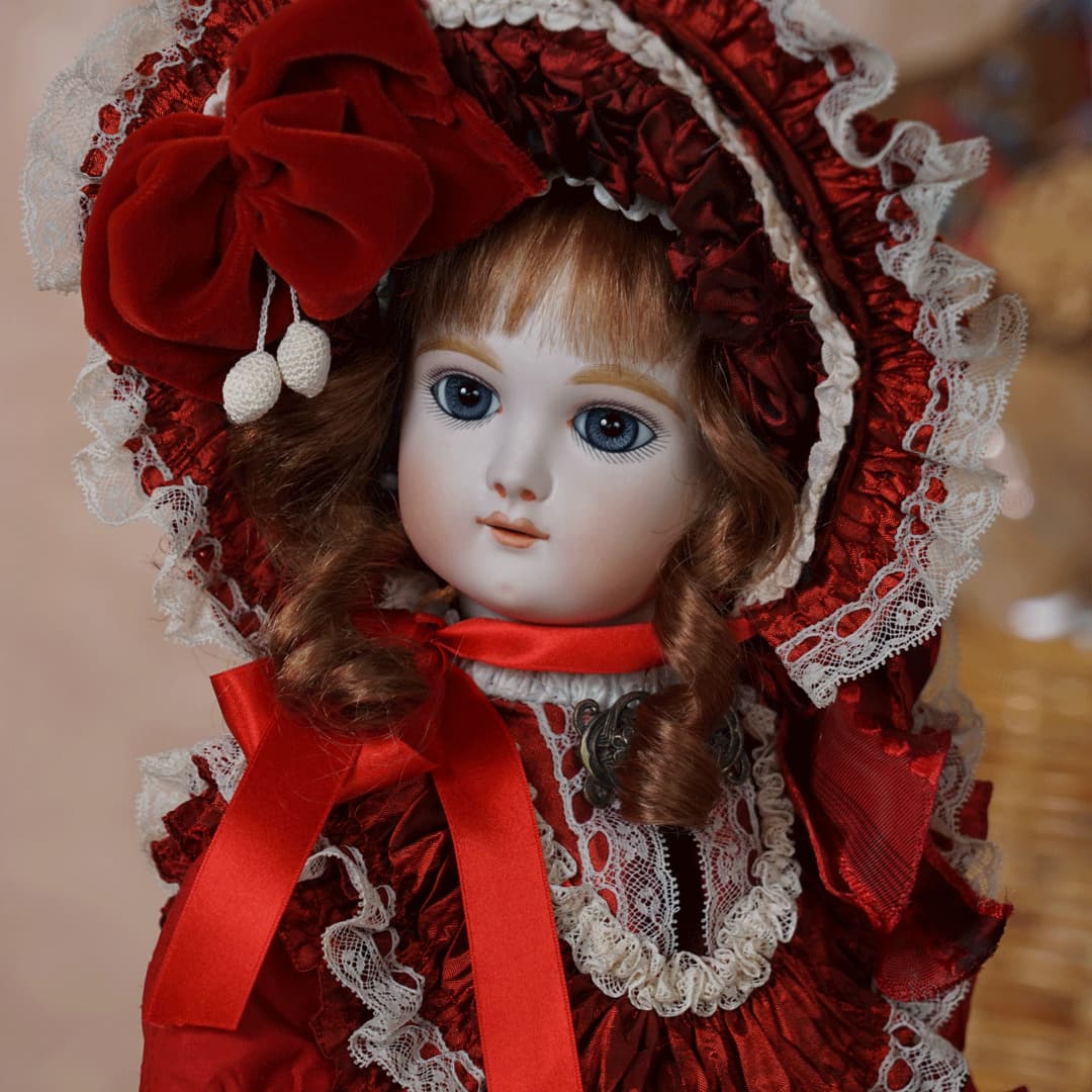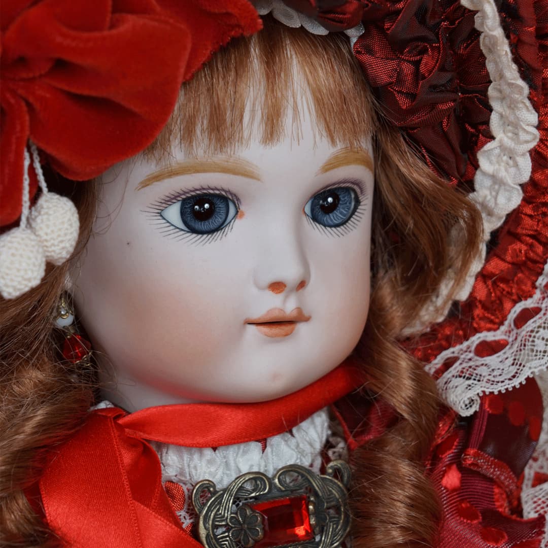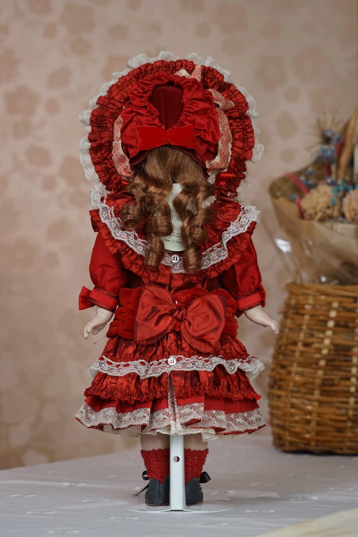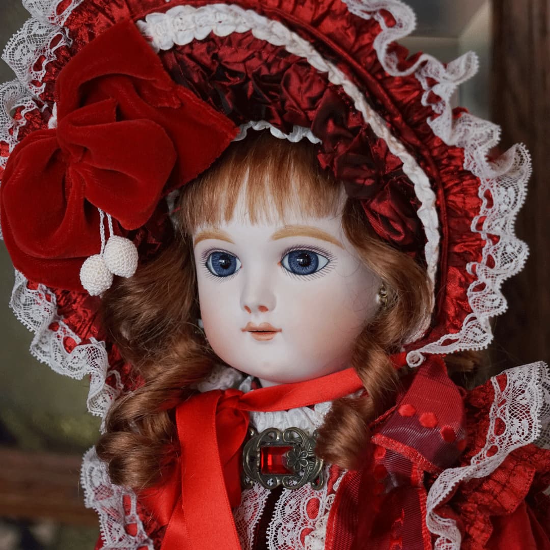 | 特長 | 2024年に誕生した美しい赤色のドレスを纏ったエデンベベです。 ブローチはヴィンテージ。赤いブローチやドレスは、女性ならば一度は憧れるものではないでしょうか。赤いドレスに縦ロールの髪型、まさしく王道の西洋人形のようです。 薔薇のように優美で美しく、あたかもオリジナルのような落ち着きと風格をも持ち合わせているように感じます。 通常ならばウィッグに隠れ見えないのですが、天蓋周りに小さなシミ状のものが見受けられます。またお人形からみて右・左の目元にある小さな点は、いずれも全体の美を損なうほどのものではございませんが、念のためお知らせ致します。 シミ状のものについて、コチラ(作家のブログ)をご参照ください。 |