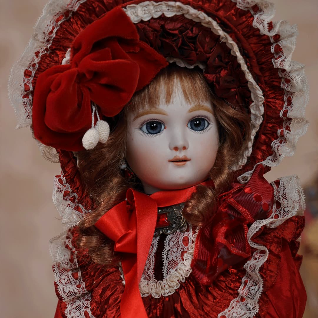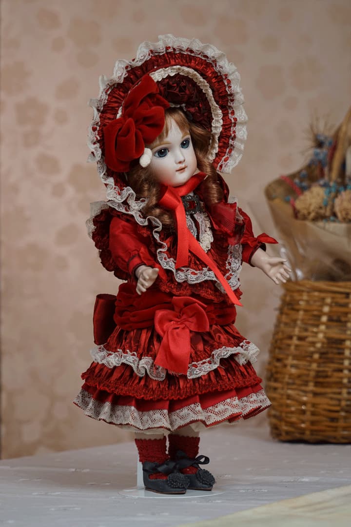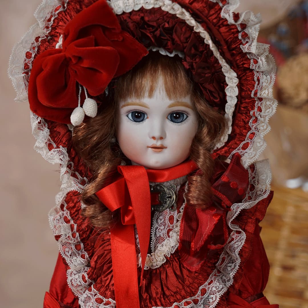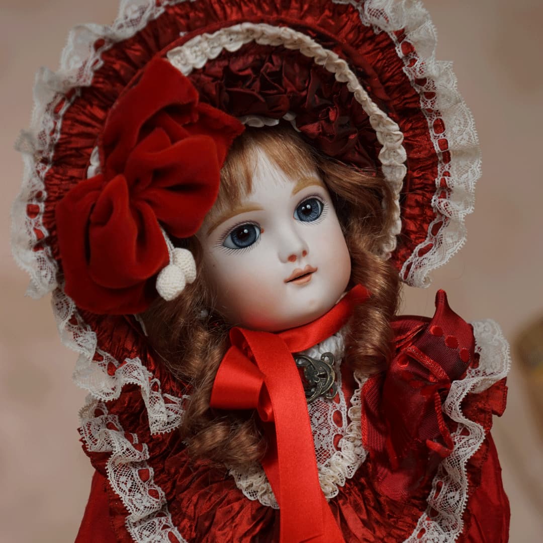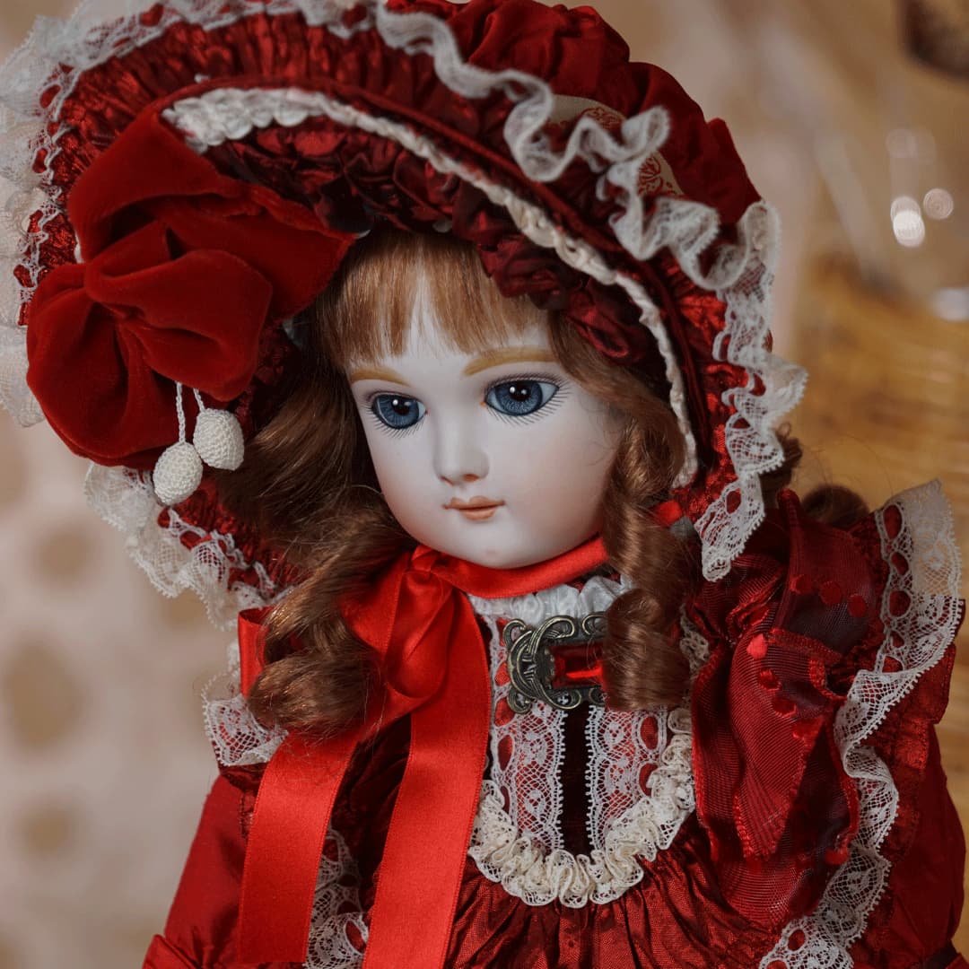 | 特長 | 2024年に誕生した美しい赤色のドレスを纏ったエデンベベです。 ブローチはヴィンテージ。赤いブローチやドレスは、女性ならば一度は憧れるものではないでしょうか。赤いドレスに縦ロールの髪型、まさしく王道の西洋人形のようです。 薔薇のように優美で美しく、あたかもオリジナルのような落ち着きと風格をも持ち合わせているように感じます。 通常ならばウィッグに隠れ見えないのですが、天蓋周りに小さなシミ状のものが見受けられます。またお人形からみて右・左の目元にある小さな点は、いずれも全体の美を損なうほどのものではございませんが、念のためお知らせ致します。 シミ状のものについて、コチラ(作家のブログ)をご参照ください。 |