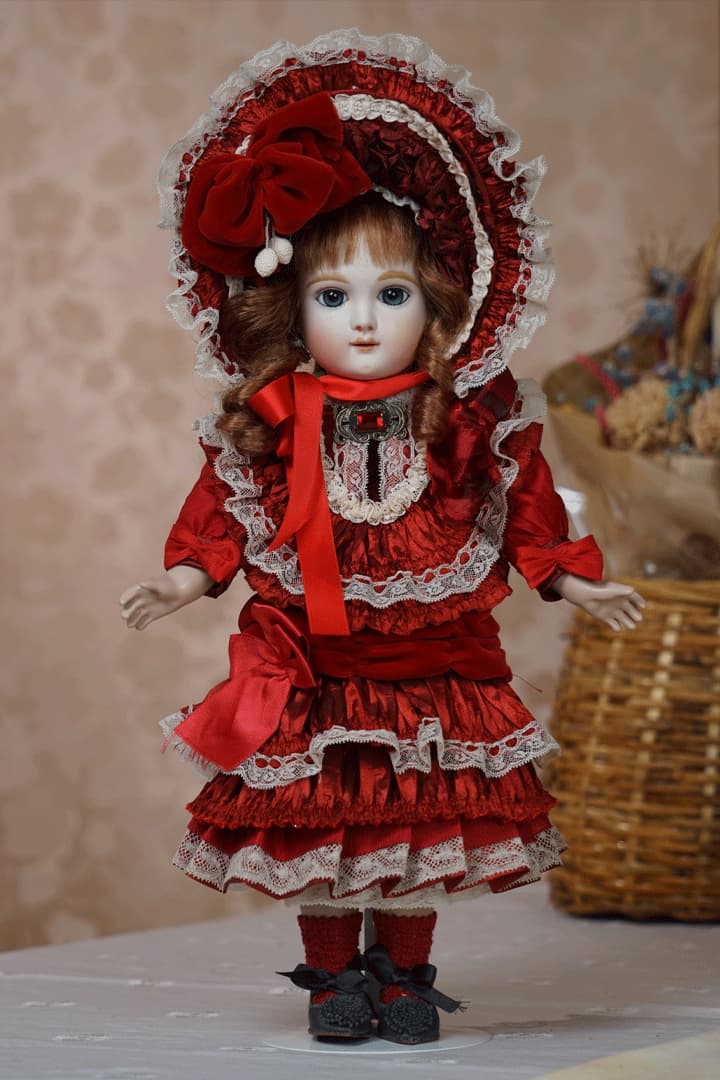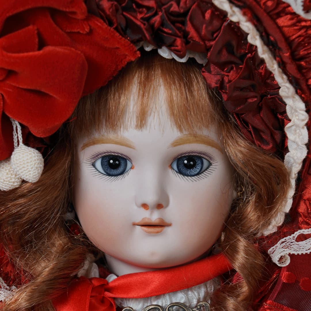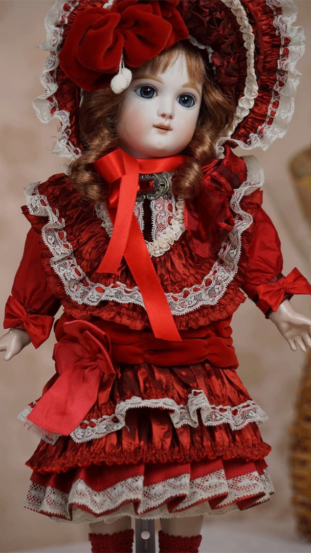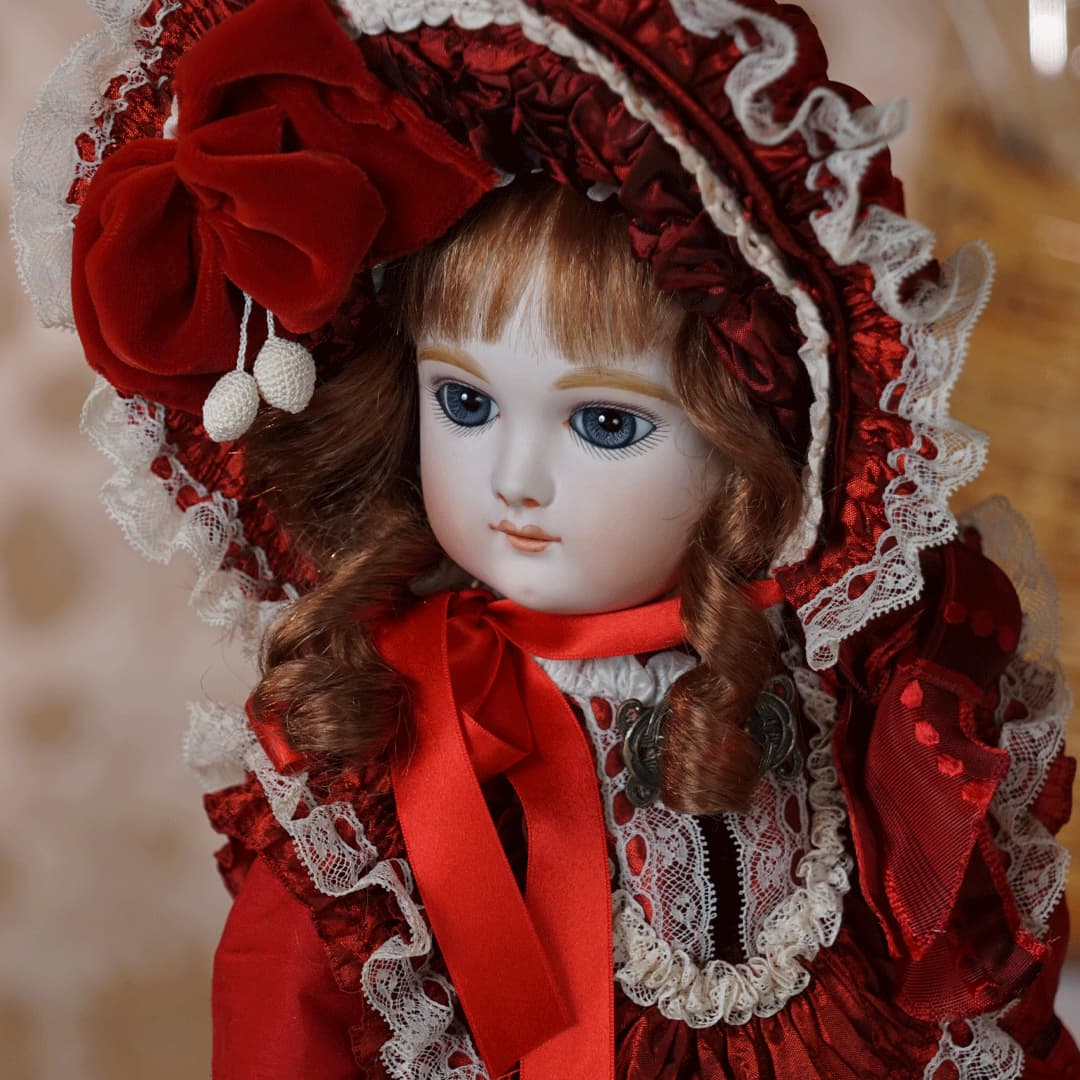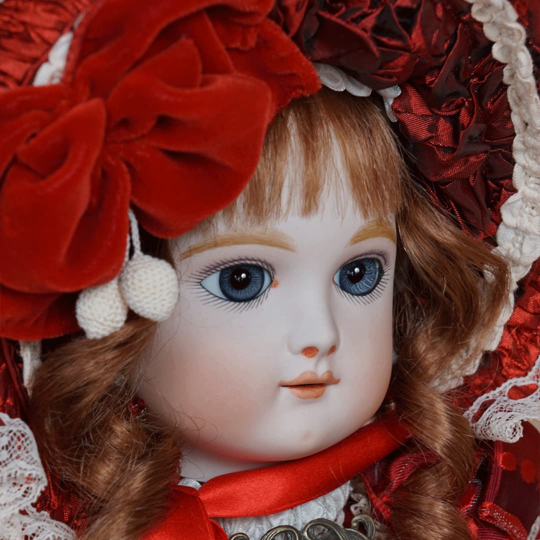 | 特長 | 2024年に誕生した美しい赤色のドレスを纏ったエデンベベです。 ブローチはヴィンテージ。赤いブローチやドレスは、女性ならば一度は憧れるものではないでしょうか。赤いドレスに縦ロールの髪型、まさしく王道の西洋人形のようです。 薔薇のように優美で美しく、あたかもオリジナルのような落ち着きと風格をも持ち合わせているように感じます。 通常ならばウィッグに隠れ見えないのですが、天蓋周りに小さなシミ状のものが見受けられます。またお人形からみて右・左の目元にある小さな点は、いずれも全体の美を損なうほどのものではございませんが、念のためお知らせ致します。 シミ状のものについて、コチラ(作家のブログ)をご参照ください。 |